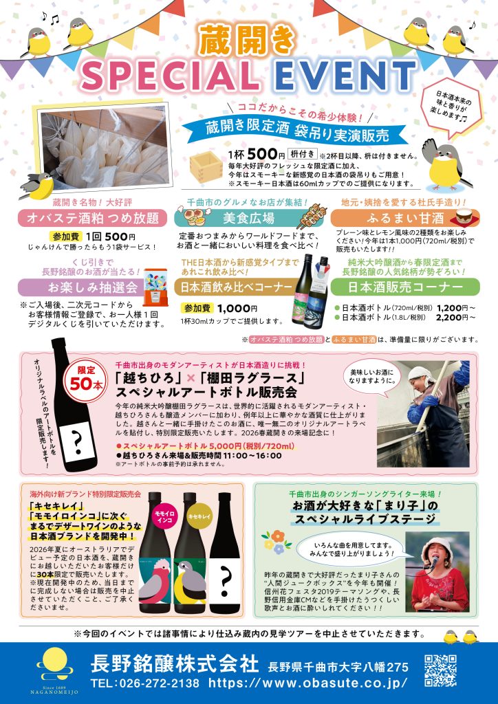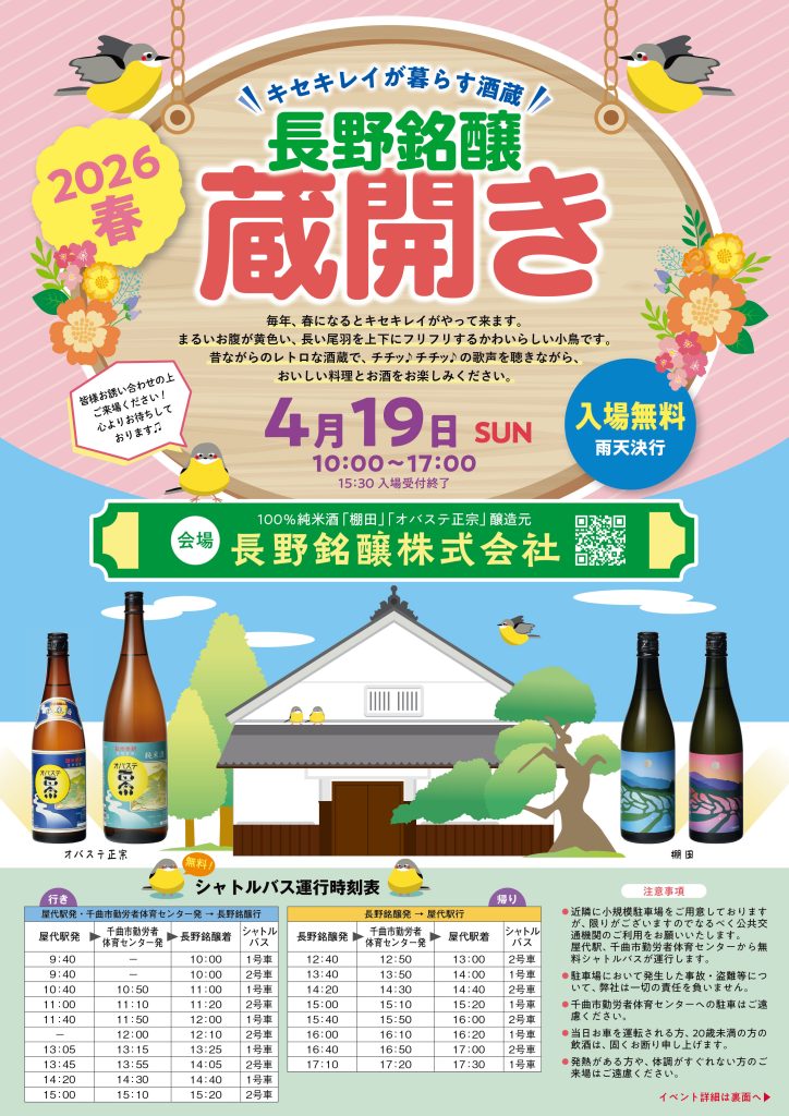 毎年恒例の「長野銘醸蔵開き」の開催が下記の通り決定しましたので、ご案内申し上げます。